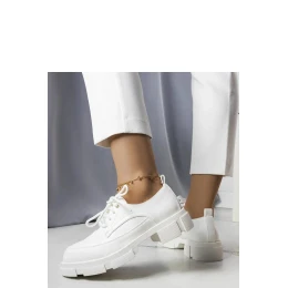 Bílé polobotky na masivní podrážce Kay jsou ideální volbou pro ty, kteří ocení pohodlí a stylový vzhled. Polobotky mají traktorovou podrážku s čtvercovým podpatkem, co jim dodává charakteru. Nízký límec sahá před kotník, a krátké šněrování vpředu jim dodává zvláštní kouzlo. Polobotky Kay jsou vyrobeny z ekologické kůže, co je šetrné k životnímu prostředí. Vnitřek bot je vyložen měkkou stélkou, co zajišťuje pohodlí při nošení po celý den. Kulatá špička a minimalistické prošívání dodávají botám elegantní vzhled. Tyto univerzální polobotky se skvěle hodí jak do každodenních outfitů, tak na speciální příležitosti. Skvěle padnou k halence s dekorativními řetízky a kožené sukní. Velikost bot je standardní, takže se můžete s důvěrou řídit svou vlastní velikostí. Materiál vnější: Ekologická kůže Podšívka: Žádná Materiál podrážky: Pryž Barva podrážky: Bílá Zapínání: Šněrování Kolekce: Léto