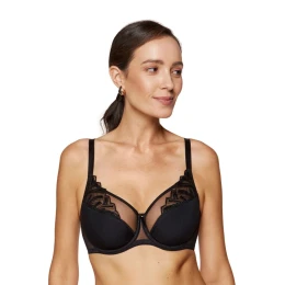 Polovičná podprsenka v čiernej farbe. Spodná časť košíčkov je vyrobená z tenkého korzetového penového materiálu a horná časť košíčkov je vyrobená z lesklého háčika, vďaka čomu sa podprsenka dokonale prispôsobí tvaru pŕs. Skvelá na asymetriu. Spodná časť košíčkov je vyrobená z vnútornej bavlny s certifikátom OEKO-TEX, vďaka čomu je šetrná k pokožke. Lesklá ozdoba medzi košíčkami. Zvislé bočné kostice stabilizujú obvod podprsenky. Podprsenka je navrhnutá a ušitá v Poľsku.