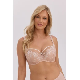 Pološiroký podprsenka Kailani v odstínech ecru a mokka je model vyrobený v populární konstrukci SS10, která kombinuje pohodlí s vynikající podporou prsou. Horní část košíčku je vyrobena z lehkého tylu obšitá jemnou páskou, zatímco dolní košíček je zpevněn pěnou a dokončen krásným, stabilním vyšívaním. Celková světlá barva zdůrazňuje přirozené tvary prsou a odstřižené záda z lycry zajistí komfort a pružnost. Svislé řezy na dolním košíčku pro lepší přizpůsobení se prsům. Zvýšené dno košíčku zakrývající bradavku. Vysoký střed podprsenky zajistí stabilitu. Dráty obklopující prsa a boční kostice pro ideální podporu, střih sbírá prsa, dává jim kulatý tvar a jemně je zvedá. Silně zakrytý střih, díky kterému prsa zůstávají na místě, polootevřená linie výstřihu. Lehce skloněná linie dolního košíčku vedena k ramínku pro perfektní přizpůsobení. Podprsenka Kailani spojuje jemnost, eleganci a vynikající modelov