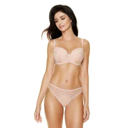 Zvodná vystužená podprsenka podporuje prsia a dodáva im krásny tvar. Košíčky sú potiahnuté mäkkou látkou s originálnym vzorom. Trojdielne košíčky z tenkej korzetovej peny. Vnútorná časť košíčkov je vypchatá bavlnou. Zadná časť podprsenky je celá z čipky s vodorovnými pruhmi vystuženými tylom na vnútornej strane. Nastaviteľné, neodnímateľné popruhy. Zvislé veľrybie kosti zabraňujúce bočnému pokrčeniu.