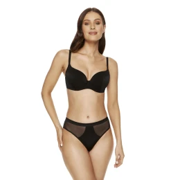 Vystužená podprsenka v čiernej farbe. Trojdielne misky z tenkej korzetovej peny potiahnuté z vonkajšej strany reliéfnou károvanou látkou. Vnútorná strana košíčkov je potiahnutá bavlnou OEKO-TEX, takže sú šetrné k pokožke. Zvislé bočné ramienka s veľrybími kosťami stabilizujú obvod podprsenky. Zadná časť podprsenky je vyrobená z tylu. Podprsenka bola navrhnutá a ušitá v Poľsku.