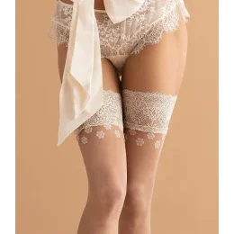 Priesvitné pančuchy s prídavkom vlákna Lycra. Podšité sú dvojtým silikónovým pásikom. Neviditeľne zosilnené prsty. Zdobené kvetovanou čipkou.