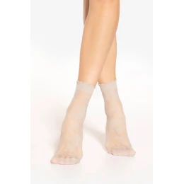 Očarujúce vysoké pančuchy 15 DEN zdobené jemným, romantickým vzorom s drobnými kvetmi, ktoré dodajú každému outfitu ľahkosť a dievčenský šarm. Sú vyrobené z tenkej, priesvitnej tkaniny, ideálnej na teplejšie dni. Dodatočné elastické manžety na prstoch zaručujú dokonalé prispôsobenie a odolnosť, čím zabraňujú zošmyknutiu pančúch počas nosenia. Tieto vzorované pančuchy sú ideálnou voľbou pre ženy, ktoré oceňujú jemné detaily a pohodlie v každodennom štýle.