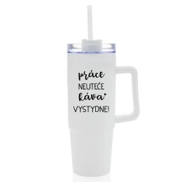 PRÁCE NEUTEČE, KÁVA VYSTYDNE! - bílý cestovní termohrnek s průhledným víčkem 900 ml