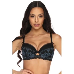 Podmanivá push-up podprsenka - košíčky zdobené vyšívaným tylom v tmavomodrej farbe - vyberateľné push-up špongie - mostík zdobený mašličkou - vrchná časť košíčkov zdobená tylom - ramienka neodnímateľné, nastaviteľné - čipkovaný obvod - zapínanie na dva háčiky s trojstupňovou reguláciou