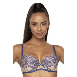 Zvodná push-up podprsenka Frances v béžovej a námorníckej modrej farbe. námornícke modré košíčky podšité béžovou bavlnou s vyberateľnými push-up vložkami. elastické sieťované boky. mašľa v strede. nastaviteľné ramienka bez ramienok. dvojité zapínanie na háčiky a oči s trojcestným nastavením.