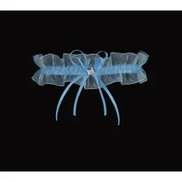 Modrý podväzok z jemného šifónu, zdobený saténovou mašľou s trblietavým korálkom, zvnútra podšitý silikónom.