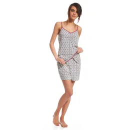 Štýlové jarné pyžamo so zložitými kvetinovými vzormi. Sivá farba v kombinácii s ružovou a ecru dodáva šarm. Blúzka s ramienkami, mierne priliehajúca k telu. Šortky s gumou.