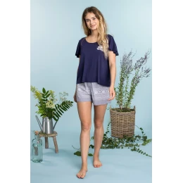 Dámske pyžamo z vysoko kvalitnej viskózy. Tričko s krátkym rukávom a jemnou potlačou na hrudi. Krátke pohodlné šortky zdobené ľudovým vzorom.