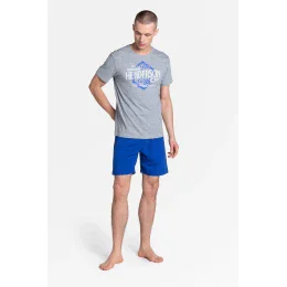 Lars - je dvojdielny pyžamový komplet v sivej a modrej farbe so šortkami pod kolená z nadčasového radu Core značky Henderson. Nájdete v ňom na dotyk príjemné materiály, pohodlné nosenie a potlače, ktoré dodávajú vzorom charakter.