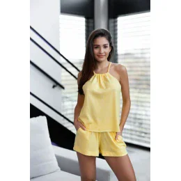 Dvojdielna súprava v krásnej slnečnej farbe, ktorá sa hodí ako domáce oblečenie, pyžamo aj letná súprava. Je vyrobená z úpletu príjemného na dotyk a skvele sa hodí ako komplet, ale aj v kombinácii s ďalšími kúskami oblečenia. Blúzka s viazaním okolo krku. Voľný strih a pohodlie. Šortky s vreckami, v páse na mäkkú gumu.