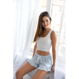 Modrobiele pyžamo s krátkym vrškom a šortkami v cene. Ideálne na sviatočné obdobie. Biely hladký top so širšími ramienkami sa hodí aj k takmer akémukoľvek inému pyžamu alebo džínsom. Kockované šortky s volánikmi okolo stehien a mašľou v páse vyzerajú neuveriteľne pôvabne.
