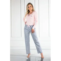 Dvojdielne dámske pyžamo Momenti Per Me Linda. Blúzka s dlhými rukávmi a gombíkmi vo výstrihu v svetloružovej farbe. Nášivka s logom značky na prednej strane. Nohavice sú tiež dlhé s elastickým pásom a mašľou. Pohodlná a atraktívna ponuka nočnej bielizne.