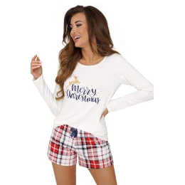 Dvojdielne pyžamo Merry II bolo vytvorené s ohľadom na kúzelné sviatočné obdobie. Blúzka príjemne obopína telo a má dlhé rukávy. Na hrudi má atmosférickú aplikáciu, sviatočného soba a pod ním nápis Merry Christmas. Krátke šortky rovného strihu, zdobené mašľou v páse. Kockovaná látka evokuje atmosféru decembrových večerov, kedy popíjame horúcu čokoládu schovaní pod teplou dekou. Pyžamo je k dispozícii v dvoch farebných variantoch: červené tričko s kockovanými nohavicami a tričko vo farbe ecru s kockovanými nohavicami.