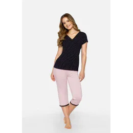 Pohodlné dámske pyžamo Cleo. Čierna blúzka z mäkkej potlačenej viskózy príjemne sedí na tele. Výstrih zdobí úzka elegantná čipka. K súprave sa hodia praktické nohavice v 3/4 dĺžke v ružovej farbe. Celok tvorí klasický, tlmený komplet.