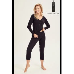 Bavlnené dámske pyžamo z pletenej prúžkovanej tkaniny. Blúzka s dlhými rukávmi a výstrihom zapínaným na patentky. Súčasťou sú nohavice s rybím vrkočom.