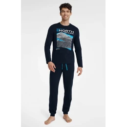 Pánske pyžamo pozostávajúce z tričká a nohavíc. Tričko s dlhými rukávmi a polguľatým výstrihom. Dlhé nohavice s gumou a zaväzovaním v páse.