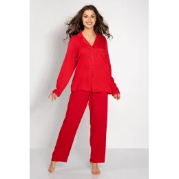 Tieto dámske pyžamá sú kvintesenciou pohodlia a elegancie. Skladá sa z košele s dlhými rukávmi na gombíky a dlhých nohavíc s pružným pásom. Výstrih do V dodáva jemnosť a elegantné lemy (lemovanie) ozvláštňujú vzhľad. Hladká tkanina je mäkká, priedušná a nedráždivá pre pohodlný spánok. Náprsné vrecko je praktickým doplnkom a voľný strih zaručuje voľnosť pohybu. Vďaka jedinečnému dizajnu a pohodliu je toto pyžamo taktiež skvelým nápadom na darček.