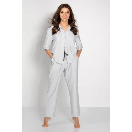 Tieto dámske pyžamá spájajú eleganciu, pohodlie a jedinečný dizajn. Košeľa má véčkový výstrih a gombíky pre eleganciu. Mäkká a vzdušná tkanina poskytuje maximálne pohodlie a jej hypoalergénne vlastnosti zaručujú, že nedráždi pokožku. Košele a nohavice majú vrecká, čo zvyšuje ich praktickosť. Ženský štýl a oversize strih poskytujú voľný a pohodlný strih. Pyžamo je vyrobené z jemnej tkaniny a zakončené ozdobným golierom. Pyžamo má tiež tlmené módne farby a vkusnú mašľu v páse. Ide o poľský výrobok najvyššej kvality. Vďaka dvojdielnej súprave je toto pyžamo ideálnym darčekom pre vás alebo inú osobu. Jeho elegantný strih podčiarkuje eleganciu a jedinečnosť každej ženy.