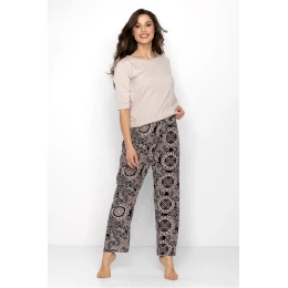 Elegantná a pohodlná dámska pyžamová súprava v 2 dieloch, ideálna ako na spanie, tak aj ako pohodlné oblečenie doma. Tričko s 3/4 rukávom a výstrihom typu U je vyrobené z jemnej viskózy, ktorá je šetrná k pokožke a poskytuje vynikajúcu priedušnosť. Jeho voľný strih umožňuje voľný pohyb a jemná farebnosť dodáva subtilitu a ženský šarm. Nohavice s dlhými nohavicami, navrhnuté v pohodlnom, voľnom strihu, majú v páse gumu, čo zaručuje ideálne prispôsobenie a pohodlie nosenia. Celý set je vyrobený z prírodných materiálov, spĺňa najvyššie štandardy kvality, čo potvrdzuje certifikácia OEKO-TEX Standard 100. Navrhnuté a vyrobené v Poľsku, pyžamo spája precíznosť spracovania so starostlivosťou o detaily. Je to ideálna voľba pre ženy, ktoré hľadajú produkt spájajúci pohodlie, estetiku a starostlivosť o životné prostredie. Zloženie: Horná časť: 96% bavlna, 4% elastan Dolná časť: 100% viskóza