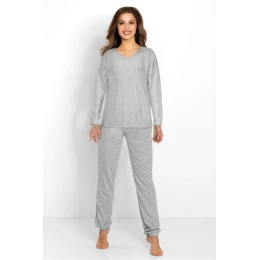 Dámsky pyžamový set, ktorý spája štýlový dizajn s pohodlím, ideálny ako na spanie, tak aj ako elegantný domáci odev. Tričko s dlhým rukávom, V výstrihom zdobeným jemným lemom, bolo navrhnuté vo voľnom oversized strihu, čo zaručuje pohodlie a voľnosť pohybu. Nohavice s pravidelným strihom a dlhými nohavicami s elastickými manžetami dodávajú celému outfitu moderný charakter. Guma v páse zaisťuje perfektné priliehanie. Celý set je vyrobený z priedušnej elastickej látky s jemným leskom, ktorá nielen krásne vyzerá, ale tiež zaisťuje maximálne pohodlie nosenia. Poľský výrobok, vytvorený s dôrazom na detaily a vysokú kvalitu spracovania, je skvelou voľbou pre ženy, ktoré ocenia spojenie pohodlia s eleganciou. Ideálne na každé ročné obdobie.