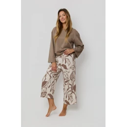 Štýlové a mimoriadne pohodlné dámske pyžamo navrhnuté s ohľadom na pohodlie a estetiku na každodenný relax. Vrchný diel je pevné tričko z vysokokvalitného bavlneného úpletu s prídavkom elastanu, ktorý je mäkký, pružný a príjemný na pokožku. Klasický okrúhly výstrih a dlhé rukávy zabezpečujú tepelný komfort a voľnosť pohybu. Voľné nohavice v dĺžke 7/8 z ľahkej, priedušnej viskózy vynikajú módnou kvetinovou potlačou. Elastický pás umiestnený v tuneli zaručuje dokonalé prispôsobenie bez odierania. Ide o ideálnu voľbu na večerné vychádzky, ako aj na štýlový relax doma.
