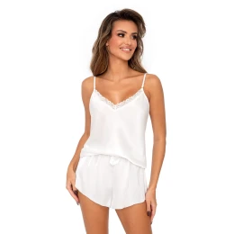 Elegantné 1/2 pyžamo značky TIFFANI, ktoré sa kúpe v perleťovom lesku. Košieľka je na tenkých nastaviteľných ramienkach. Jemný výstrih zdobí priehľadná čipka. Látka mäkko obopína telo a zakrýva nohavice. Šortky sú voľného strihu, s vyšším pásom, veľmi pohodlné, s jemne zapraveným pásom, zakončené mašličkou. Spodná línia šortiek je mierne vykrojená a zaoblená, vďaka čomu nohy vyzerajú dlhšie. vyrobené v Poľsku.