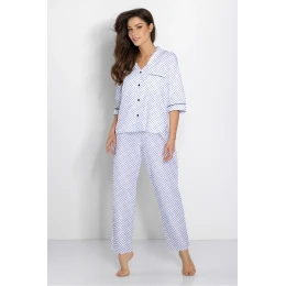 Toto elegantné pyžamo spĺňa najvyššie štandardy kvality, o čom svedčí certifikát OEKO-TEX Standard 100, ktorý zaručuje bezpečnosť vašej pokožky a pohodlie pri nosení. Počnúc jemnou farebnou schémou vyžaruje toto pyžamo jemný pôvab, ktorý je ideálny na relaxáciu po dlhom dni. Elegantné lemovanie dodáva jedinečný vzhľad a zdôrazňuje vysokú kvalitu spracovania. Vďaka hypoalergénnemu materiálu je ??šetrný ku všetkým typom pokožky. Vrecká na bokoch nohavíc a náprsné vrecko dodávajú nohaviciam funkčnosť a praktickosť. Vďaka nadrozmernému strihu a voľnému, pohodlnému strihu sa pyžamo dokonale prispôsobí vášmu telu a zabezpečí voľnosť pohybu a pohodlie počas spánku. Manžetové rukávy dodávajú elegantný nádych a dlhé nohavice s elastickým pásom zaručujú dokonalé prispôsobenie. Pyžamo je vyrobené z mäkkého materiálu, ktorý je nielen príjemný na pokožku, ale aj odolný a ľahko sa udržiava. Obojok a vysokokvalitné materiály zaručujú dlhodobú spokojnosť s používaním. Pyžamo je navrhnuté a ušité v Poľsku a spája poľské krajčírske tradície s moderným dizajnom, čím vznikol jedinečný výrobok, vďaka ktorému sa budete cítiť výnimočne každý večer. Táto elegantne strihaná dvojdielna súprava je viac ako len pyžamo a sľubuje pokojný a pohodlný spánok, ktorý si zaslúžite.