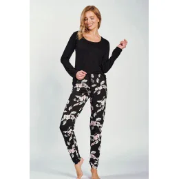 Pyžamo z kvalitnej viskózy a bavlny. Jednofarebná blúzka s dlhými rukávmi a polkruhovým výstrihom. Blúzka z rebrovaného úpletu. Dlhé nohavice s veľkými kvetmi, pohodlné, v páse na gumu. zloženie: blúzka. zloženie: vrchná časť: 95 % viskóza, 5 % elastan . spodná časť: 100 % bavlna