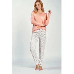 Dámske pyžamo vhodné na každý večer, ktoré sa skladá z blúzky s dlhým rukávom a nohavíc. Blúzka má polkruhový výstrih a jemnú potlač v hornej časti, voľný a pohodlný strih pre voľnosť pohybu. Je vyrobená z mäkkej a vzdušnej tkaniny, ktorá je príjemná na dotyk. Šortky majú roztomilú potlač a dlhé nohavice a absencia vreciek zdôrazňuje minimalistický dizajn. Elastický pás zaručuje pohodlné nosenie a ozdobná mašľa dodáva elegantný nádych. Pyžamo je zabalené v praktickom vrecúšku, čo z neho robí ideálny nápad na darček.