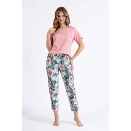 Dámska pyžamová súprava spájajúca pohodlie a jemný pôvab. Tričko s krátkymi rukávmi, výstrihom a náprsným vreckom zdobeným jemnou mašľou má voľný a pohodlný strih, ideálny na spanie. Je vyrobené z mäkkej a priedušnej tkaniny a poskytuje plný komfort pri nosení. Celá súprava je zabalená vo vrecúšku, vďaka čomu je aj skvelým darčekom. Nohavice s potlačou v dĺžke 7/8 bez vreciek majú pravidelný strih, ktorý sa prispôsobí postave. Elastický pás a ozdobná mašľa dodávajú pyžamu eleganciu a šarm.