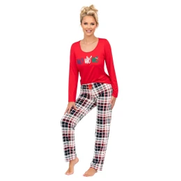 Dámska vianočná pyžamová súprava, ideálna ako darček a pohodlné domáce oblečenie. Košeľa s dlhými rukávmi a okrúhlym výstrihom je zdobená nápismi, ktoré jej dodávajú šarm. Voľný, pohodlný strih košele a mäkký, priedušný materiál zaručujú pohodlie počas nosenia. Nohavice s dlhými nohavicami majú klasický károvaný vzor, v páse je vložený elastický pás a ozdobná mašľa zaručuje ideálne prispôsobenie. Chýbajúce vrecká zdôrazňujú ľahkosť strihu. Pyžamo je navrhnuté a ušité v Poľsku s dôrazom na detail a vyznačuje sa vysokou kvalitou spracovania.