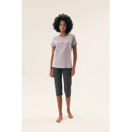 Elegantné a pohodlné dámske pyžamo, ktoré zaručuje pohodlný spánok a relaxáciu doma. Tričko s krátkymi rukávmi a okrúhlym výstrihom má módnu potlač, ktorá mu dodáva šarm. Je vyrobené z mäkkej tkaniny a zaručuje pohodlie pri nosení. 3/4 nohavice majú jemnú potlač a tlmenú farebnosť. Široký elastický pás a šnúrky na stiahnutie zaručujú ideálne prispôsobenie a pohodlie. Skvelá voľba pre ženy, ktoré oceňujú kombináciu pohodlia a štýlu vo svojom nočnom šatníku!