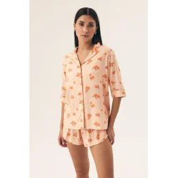 Elegantná dámska pyžamová súprava s jemnými ozdobnými detailmi, ktorá spája štýl s pohodlím. Košeľa s krátkymi rukávmi, zapínaním na gombíky a golierom vytvára klasický a zároveň pohodlný vzhľad. Voľný strih poskytuje voľnosť pohybu a materiál s potlačou dodáva šarm. Šortky bez vreciek so širokým elastickým pásom zabezpečujú pohodlie počas celej noci. Sú vyrobené z priedušného úpletu, ideálneho na teplé noci. Pyžamo je zabalené v praktickom fóliovom vrecúšku, ideálnom ako darček.