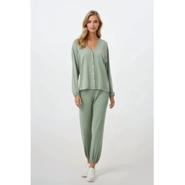 Elegantní dámské pyžamo s ženským a pohodlným střihem, ideální jak pro spaní, tak i jako stylové oblečení na doma. Dvoudílná sada se skládá z košile s dlouhým rukávem, zapínající se na knoflíky, s výstřihem do špičky a decentní, jemnou barevností. Rukávy jsou zakončeny měkkým lemem, který zajistí pohodlí a praktičnost, zejména v chladnějších dnech. Dlouhé kalhoty s širší nohavicí a elastickým pásem zaručují volnost pohybu a ideální přizpůsobení. Vyrobena z jemné, prodyšné viskózy, pyžamo je přátelské k pokožce a skvěle se hodí i pro ženy s větším poprsím. Navrženo a ušito v Polsku, skvělá volba jako dárek nebo jako každodenní, stylové noční prádlo.
