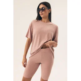 Pohodlné a štýlové dámske pyžamo, ideálne na spanie aj ako pohodlný domáci odev. Je vyrobené z mäkkého, priedušného úpletu s pruhovanou štruktúrou, ktorý poskytuje úplnú voľnosť pohybu a dokonale prilieha k telu. Vrchná časť pyžama má voľný strih a polkruhový výstrih, vďaka čomu skvele sedí na postave a neobmedzuje v pohybe. Legíny siahajúce pred kolená majú široký elastický pás, ktorý zaisťuje pohodlné a stabilné nosenie. Súprava je skvelá nielen ako pyžamo, ale aj ako domáci odev na lenivé rána alebo relaxačné večery. Celá súprava je zabalená v praktickom fóliovom vrecku.