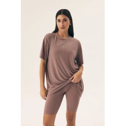 Pohodlné a štýlové dámske pyžamo, ideálne na spanie aj ako pohodlné oblečenie na doma. Je vyrobené z mäkkého, priedušného pleteného materiálu s pruhovanou štruktúrou, ktorý poskytuje úplnú voľnosť pohybu a skvele prilieha k telu. Vrchná časť pyžama má voľný strih a polkruhový výstrih, vďaka čomu skvele sedí na postave a neobmedzuje v pohybe. Legíny siahajúce po kolená majú široký elastický pás, ktorý zabezpečuje pohodlné a stabilné nosenie. Táto súprava je skvelá nielen ako pyžamo, ale aj ako domáce oblečenie na lenivé rána alebo relaxačné večery. Celá súprava je zabalená v praktickom fóliovom vrecúšku.