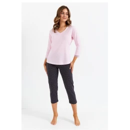 Elegantné a pohodlné dámske pyžamo, ideálne na každé ročné obdobie. Vrchný diel má ženský výstrih do V, ktorý jemne zvýrazňuje krk a dekolt. 3/4 dlhé rukávy sú zakončené jemnou čipkou, ktorá dodáva ľahkosť a šarm. 3/4 dlhé nohavice majú jednoduchý, klasický strih bez vreciek, ktorý poskytuje maximálne pohodlie počas spánku a relaxácie. Pyžamo je vyrobené z príjemného materiálu, skvelé pre ženy, ktoré ocenia kombináciu štýlu a pohodlia.