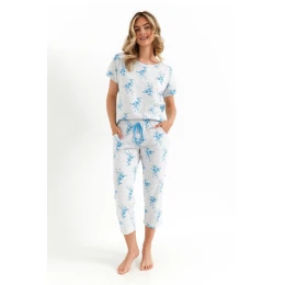Pohodlná a štýlová dámska pyžamová súprava z mäkkého materiálu s modernou potlačou. Voľný strih poskytuje voľnosť a pohodlie počas spánku a odpočinku. Vrchný diel s klasickým polkruhovým výstrihom a krátkymi rukávmi je ideálny na teplejšie dni. Model je vybavený praktickými vreckami, ktoré zvyšujú jeho funkčnosť. 3/4 nohavice majú elastický pás a dodatočné šnúrky, ktoré umožňujú prispôsobenie. Celá súprava je zabalená v praktickom fóliovom vrecku, ktoré je skvelou voľbou aj ako darček.