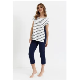Klasická a pohodlná dámska pyžamová súprava, ideálna na teplejšie noci. Tričko s krátkymi rukávmi a polo výstrihom poskytuje voľnosť pohybu a pohodlie pri nosení. Jednoduchý, nadčasový strih je vhodný na spanie aj domáci relax. 3/4 nohavice bez vreciek majú elastický pás, ktorý zaručuje ideálne prispôsobenie postave. Celá súprava je zabalená v praktickom fóliovom vrecúšku, skvelom aj ako darček.