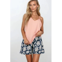 Elegantní a pohodlná dvoudílná dámská pyžama je ideální kombinací elegance, ženského půvabu a pohodlí. Vyrobena z jemné, elastické a hypoalergenní viskózy přírodního původu, zaručuje pohodlí při nošení jak v noci, tak během dne, skvěle se hodí také jako domácí oděv. Top s ramínky a výstřihem ve tvaru špičky krásně zdůrazňuje ramena a zeštíhluje krk, zatímco jemná aplikace v oblasti prsou dodává celku šarm a výjimečný charakter. Volný, ale zároveň elegantní střih poskytuje plnou volnost pohybu a pohodlí nošení. Krátké kalhoty s gumou v pase se skvěle přizpůsobí postavě, neomezují a nepřekážejí v pohybu. Celkový vzhled je udržován v elegantním stylu, s vysokou kvalitou potisku materiálu a pečlivým provedením. Navrženo a ušito v Polsku, toto pyžamo je skvělým návrhem pro ženy, které oceňují pohodlí, kvalitu a decentní styl jak pro spaní, tak i pro lenivá domácí rána. Složení: Horní část: 92% viskóza, 8% elas