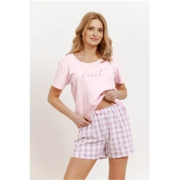 Elegantná a pohodlná dámska pyžamová súprava ideálna na teplé dni. Tričko s krátkymi rukávmi a polkruhovým výstrihom s módnym nápisom poskytuje voľnosť pohybu a pohodlie pri nosení. Vďaka voľnému strihu je mimoriadne pohodlné a mäkký materiál sa dobre prispôsobí postave. Súčasťou súpravy sú krátke šortky s roztomilou potlačou, bez vreciek, s elastickým pásom a ozdobnou mašľou, ktorá dodáva dievčenský šarm. Celá súprava je zabalená v praktickom fóliovom vrecúšku, ktoré sa výborne hodí aj ako darček.
