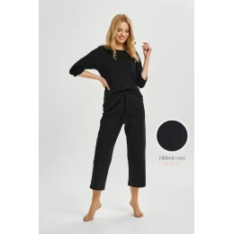 Elegantné a pohodlné dámske pyžamo, vytvorené s ohľadom na každodenný relax. Blúzka s 3/4 rukávmi a výstrihom do V, zakončená ozdobným lemom, dodáva celku jemnú eleganciu. Je vyrobená z mäkkej rebrovanej tkaniny, ktorá je príjemná na pokožku a zabezpečuje dostatočnú priedušnosť. Voľný, pohodlný strih zaručuje voľnosť pohybu počas celej noci. Nohavice s dĺžkou 7/8, bez vreciek, sú zdobené jemným vzorom. Široký elastický pás a šnúrky umožňujú ideálne prispôsobenie sa postave. Celá súprava je zabalená v praktickom fóliovom vrecúšku, skvelom pre seba alebo ako darček.