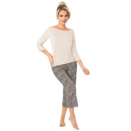 Pohodlné a ženské dámske pyžamo vyrobené z mäkkej, priedušnej viskózy, ktorá skvele sedí a poskytuje výnimočný komfort pri nosení. Tričko s 3/4 rukávmi a polkruhovým výstrihom spája jednoduchosť s eleganciou, čím vytvára ideálnu ponuku na každé ročné obdobie. K súprave patria 3/4 nohavice s modernou potlačou. Absencia vreciek a elastický pás zaručujú, že nohavice sú ľahké, neobmedzujú v pohybe a dokonale sedia na tele. Súprava je zabalená v praktickom fóliovom vrecúšku, ktoré je ideálne aj ako darček alebo ako pyžamo na cesty.