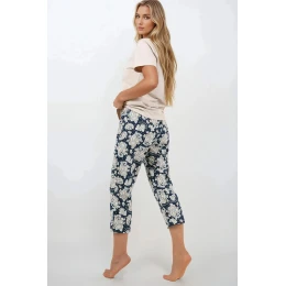 Elegantné dámske pyžamo s voľným a pohodlným strihom, vyrobené z prírodných materiálov, ktoré zaručujú mäkkosť a priedušnosť. Dvojdielna súprava pozostáva z trička s polkruhovým výstrihom a krátkymi rukávmi a nohavíc s dĺžkou 7/8 s rovnými nohavicami a elastickým pásom pre ideálne prispôsobenie. Pyžamo nemá žiadne vrecká, čo zdôrazňuje jeho minimalistický, elegantný strih. Poľský výrobok navrhnutý a ušitý s dôrazom na vysokú kvalitu potlače materiálu a detailov, čo zaručuje pohodlie a štýl počas relaxácie