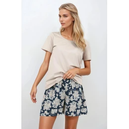 Dámska pyžamová súprava s certifikátom OEKO-TEX Standard 100, vyrobená z prírodných, hypoalergénnych materiálov, ktoré poskytujú pohodlie a bezpečnosť pre citlivú pokožku. Dvojdielna súprava pozostáva z voľného vrchného dielu s polkruhovým výstrihom a krátkymi rukávmi a elegantných nohavíc s módnou potlačou a elastickým pásom pre ideálne prispôsobenie. Vďaka ženskému štýlu a elegantnému dizajnu je pyžamová súprava dokonalou kombináciou pohodlia a estetiky. Poľský výrobok, navrhnutý a ušitý s dôrazom na vysokú kvalitu potlače a detailov.