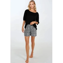Dámske dvojdielne pyžamo s pravidelným strihom, vyrobené z mäkkej a priedušnej viskózy. Blúzka s polkruhovým výstrihom a 3/4 rukávmi má voľný, pohodlný strih, ideálny aj ako domáce oblečenie. Súčasťou súpravy sú šortky s potlačou, vybavené elastickým pásom pre pohodlné nosenie. Súprava sa vyznačuje vysokou kvalitou spracovania, bola navrhnutá a ušitá v Poľsku.