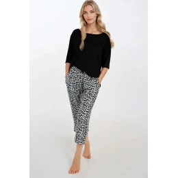 Dámsky dvojdielny pyžamový komplet vyrobený z mäkkej viskózy, ktorá poskytuje pohodlie a priedušnosť. Tričko s 3/4 rukávmi má okrúhly výstrih s lemom a je v jemných, mäkkých farbách. Oversize nohavice s bočnými vreckami sú zdobené jemným vzorom a majú elastický pás pre pohodlné nosenie. Pyžamo sa celkovo vyznačuje vysokou kvalitou spracovania a vďaka voľnému strihu je vhodné aj ako domáce oblečenie