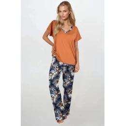 Objevte dokonalou kombinaci pohodlí a ženského stylu s tímto ženským pyžamem. Dvoudílná sada se skládá z trička v jednobarevném provedení s kontrastním zdobením výstřihu a dlouhých kalhot s moderním potiskem. Pyžamo má volný, pohodlný střih, který zajistí plnou volnost pohybu a pohodlí během spánku. Jednoduchý střih nohavic a gumový pas zaručují ideální přizpůsobení postavě, zatímco krátký rukáv zajišťuje, že sada bude skvěle sloužit po celý rok. Vyrobeno z prodyšné pleteniny/tkaniny, pyžamo je příjemné na dotek a příjemné k pokožce. Celá sada byla navržena a vyrobena v Polsku s důrazem na detaily a vysokou kvalitu zpracování. Složení: Horní část: 95 % viskóza, 5 % elastan Dolní část: 100 % viskóza
