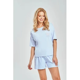 Pohodlná a ľahká dámska pyžamová súprava, ktorá je ideálna na teplé noci a domáci relax. Tričko s okrúhlym výstrihom a krátkymi rukávmi poskytuje voľnosť pohybu a klasický, univerzálny vzhľad. Voľný, pohodlný strih zaručuje maximálne pohodlie počas spánku. Súčasťou súpravy sú krátke nohavice s módnou potlačou, ktoré dodávajú súprave charakter. Model má elastický pás, vďaka ktorému sa ľahko prispôsobí vašej postave. Nohavice nemajú žiadne vrecká, čo zdôrazňuje ich ľahký a minimalistický strih. Pyžamo je vyrobené z mäkkého a priedušného materiálu a dodáva sa zabalené v praktickom fóliovom vrecku.